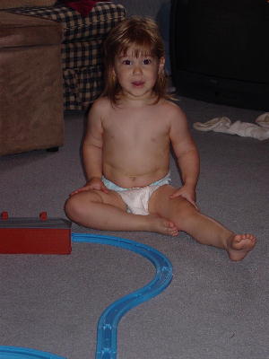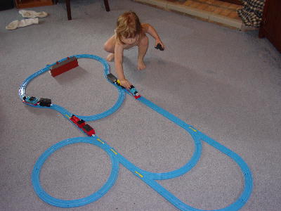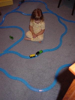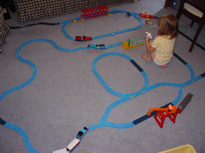 06/15/05 - Kaira's newest obsession - Thomas the Train! We are quickly acquiring a massive collection of trains and tracks, which she insists on playing with every day.