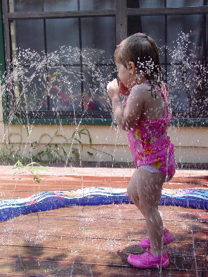 06/09/05 - During the summer at Kaira's school, they have some sprinklers built into the playground for the kids to play in. Everyone gets dressed up in their swimsuits and has a blast running through the water. They'll get to do this twice a week all summer long - and she's been having a blast!
