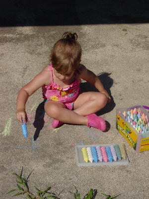 06/19/05 - Seeing how much fun Kaira had with the sprinklers at school, I went out and got one for us to play with at home. I also found some sidewalk chalk and she was pretty excited about being able to color all over the ground