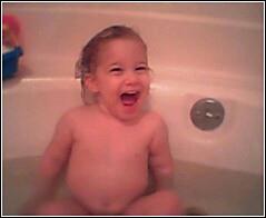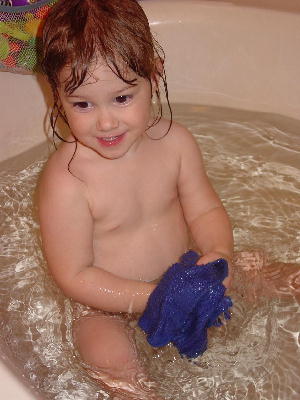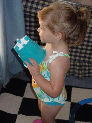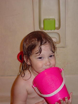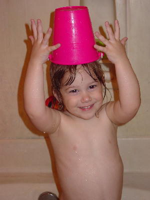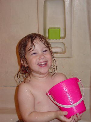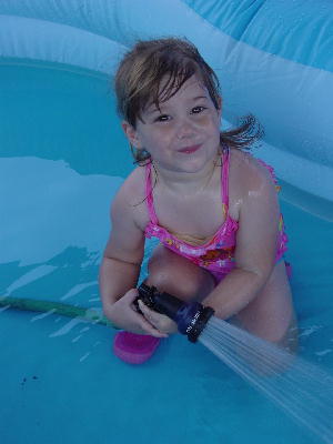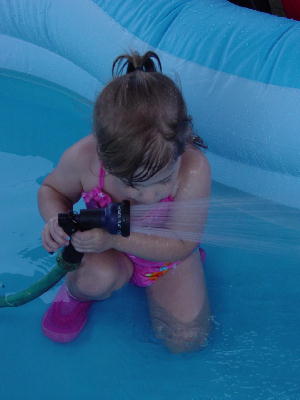 06/20/05 - Playing in our pool in the backyard. I'm not sure which was more fun - the pool or the hose. I didn't think she was strong enough to work the hose. I set it down to do something - she picked it up and hosed me down! She thought it was just about the funniest thing ever chasing mommy around the yard with the hose.