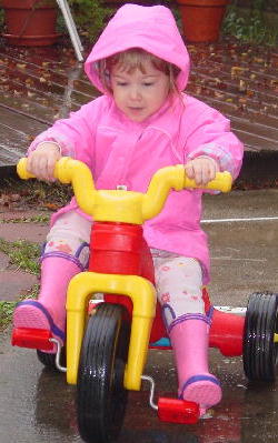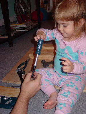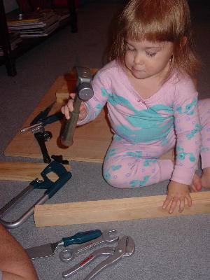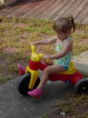 11/23/04 - I think we have gone outside to play with the bike everyday for weeks now. She rides it, she makes us ride it, she chases us while riding it, sometimes even Julia (bear) rides it. Today she decided it needed a little tune-up. She ran inside and came back out with her tool box. She tinkered on it like a pro for quite a while. She hammered, tightened screws, checked the handle bars (and even sawed the wheels, but I'm not sure that would have been entirely productive). She even knows the names of most of the tools. It was funny "operate" with her - pass me the hammer..."hamma", pass me the wrench..."wench", pass me the screwdriver... well, she's still having trouble with that one.