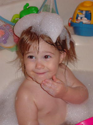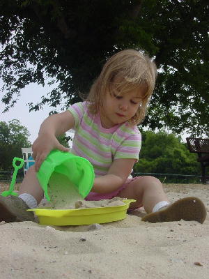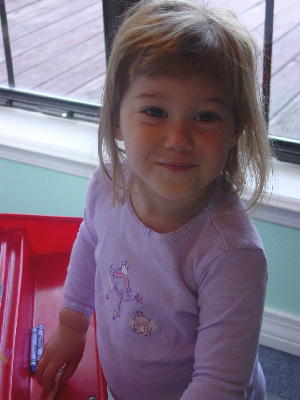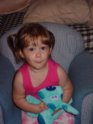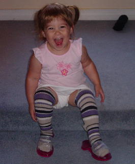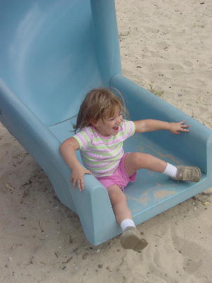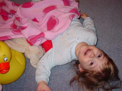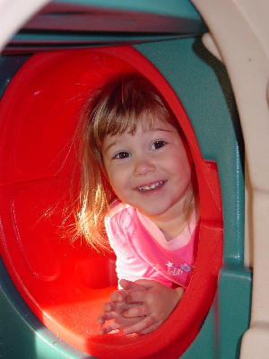 09/29/04 - Today went a little better than yesterday, but she's still not happy about being left at school without us. Once she gets to know her teachers and the other kids a little better, I think she will start to have a lot of fun. She started being more friendly with a few of the other kids today. And she came home pretty dirty, so she must have had a good time on the playground. She still didn't nap today (you can guess what kind of mood she was in tonight after missing a much-needed nap two days in a row!), but she actually laid down on her little cot the whole time like the other kids - just didn't sleep. I think it helped that we brought her blanket from home and Julia (the pink bear). She also actually ate lunch today, so that's an improvement. She goes back next on Friday, so hopefully the progress will continue. But I'm sure she will be thrilled to get to stay home with Mommy tomorrow.
