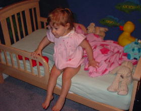 09/25/04 - Kaira got her "big girl" bed today (it's a toddler bed), and has been playing in it all day. She is having such a blast. She actually stayed in it at naptime too - I was afraid she might wander because nothing was holding her in. She is actually still in her room playing quietly, so I am really enjoying this. I will get some pictures of the bed up as soon as I can. She's very happy about getting this big girl promotion. Now we are going to see if we can get away with leaving the pacifiers in the crib as we make this transition. She hasn't needed them for a long time, just likes to have them around - hard habit to break too. She did fine without at naptime today, so hopefully that will continue. If we can make it a few days, then we are in the clear.