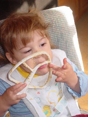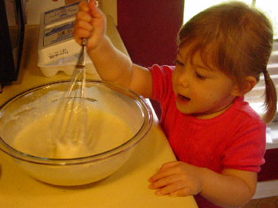 03/27/05 - Making breakfast on Easter morning... Kaira is getting to be a pretty good helper in the kitchen. She pours, counts and stirs (and makes a mess sometimes!). She has also appointed herself in charge of licking any beaters.