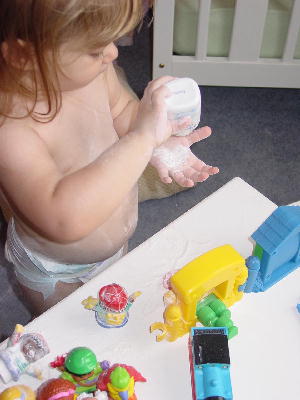 02/06/05 - Kaira managed to get a hold of a baby powder bottle while I was in the other room doing laundry. When she was quiet a little too long, I went in to check on her... and found her powdering all of her Little People. By the time I found her, the powder was everywhere! So I just let her continue and went to grab the camera. At that point, there's not much else you can do but laugh and take pictures. I eventually got the vacuum out, and she got hers out too and helped me clean it up.