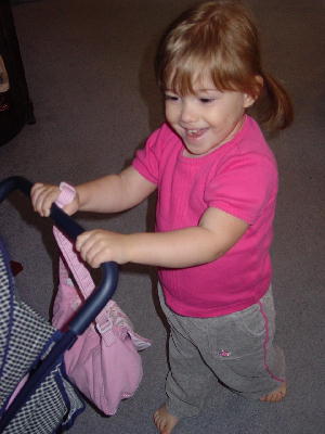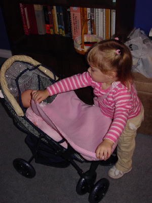 1/10/05 - Taking "baby" for a ride in her new stroller. She has her baby all tucked in with a blanket and even has a diaper bag for her too.
