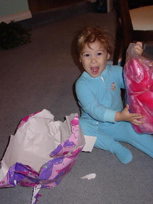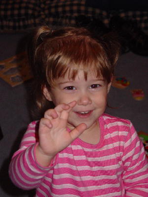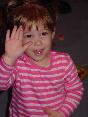 11/17/04 - Kaira has been doing very well at school lately. She has started to nap consistently and has been coming home with "Happy" checked off on her report sheet every day. She even napped the full two hours for the first time this week (she usually gets about an hour or so). She looks forward to going in the morning now, and has been coming home with some neat projects. She's learned a lot at school, both good ("Twinkle, Twinkle Little Star") and bad ("Mine!"). She often comes home all sorts of good stuff on her clothes - from dirt to paint to food. I guess that's the sign of a good time!
