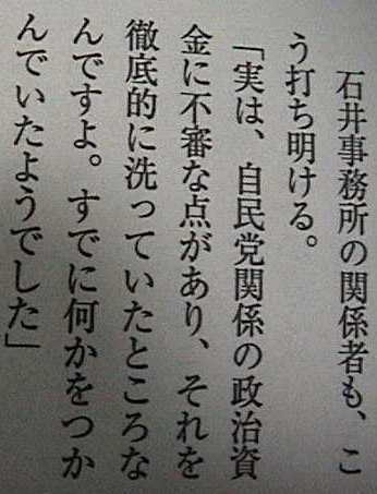 (解説=この記事の疑問。「これが表ざたになったら、与党の連中がひっくり返るような大ネタ」が産廃がらみの利権程度のものであるはずがない。産廃がらみの利権など日本中にある。大きな疑惑をそこに「オトす」ための記事なのか。もっと不思議なのは石井ひとりがこつこつと調べていたそのような疑惑を日本のマスコミは大組織を持ち取材網を持っているにも関わらず、どこも追及しないばかりかむしろ隠蔽の役割をしていたのではないか、ということである。)