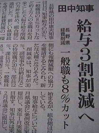 田中康夫知事は2001年度17億円、2002年度133億円、県債の発行を実質減らしている。そして2002年度予算で公共事業費で340億円(前年実績の20%減)に抑えた。また、168の事業を廃止し、271の事業を縮小した。田中康夫には若者たちの将来を借金返済の人生にしてはならないという確固たる思いがある。