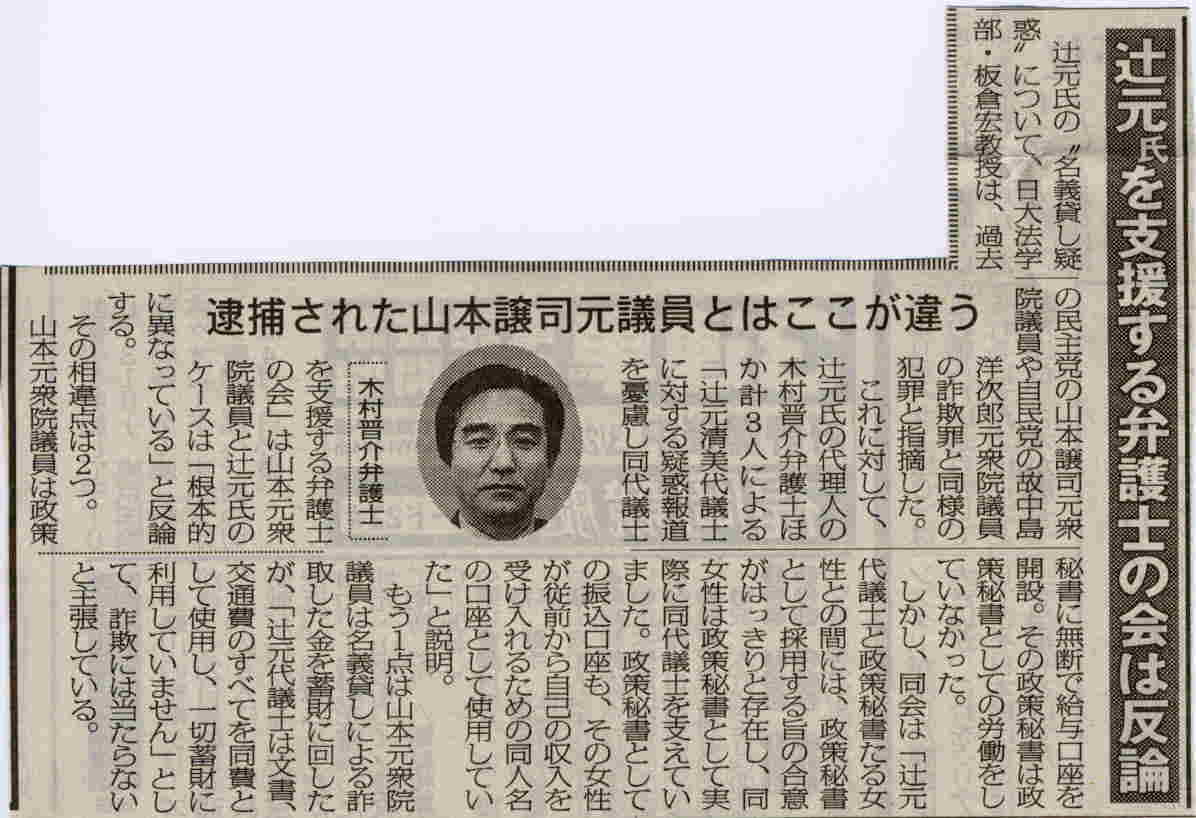 「市民オンブズ・なら」の川田賢司・代表委員は「(献金を)小口に振り分けること自体が変だ。形式が整っていればいいと思っているのかもしれないが、『脱法的なごまかし』という印象を受ける。逃げ隠れしないで、説明すべきだ」と批判。県市民オンブズマンの桐山幸矩・代表幹事は「もし、これで幕を引こうとするのなら、先の統一補欠選挙に勝った自民党のおごりを感じる」と党の対応にも疑問を投げかけている。 疑惑発覚後、自民党奈良県連にも田野瀬議員からの連絡はないという。会長代行の出口武男・県議は「事実でないのであれば、自分で説明しないといけないのでは。(党の)幹部が説明するというのはおかしい。県議会で一緒だった時期もあり、クリーンな人だと思っていたので、事実ではないと思いたい」と、党まかせにせず、本人による説明を求めた。 このフザケタ扱いは何なんだ! 自民党・田野瀬のゴマカシは辻元の比ではない。 だが、翼賛マスコミは見て見ぬ振りである。 辻元に襲いかかった3大マスコミは 辻元清美追い落としの策謀が秘書給与問題などではなかったことを田野瀬の扱い方で自ら露呈した。 |
