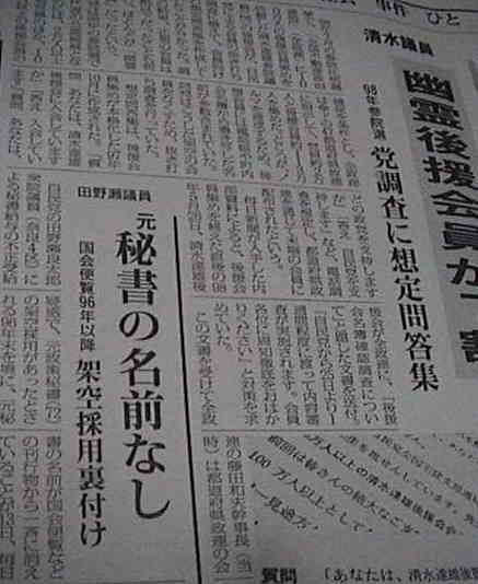 毎日新聞2002-11月15日 田野瀬議員: 自民関係者も不信 強引な“幕引き”に地元 自民党の田野瀬良太郎衆院議員(奈良4区)による秘書給与の不正受給疑惑について、自民党は15日、「問題なし」とする調査結果を発表したが、選挙区の奈良県では「本人がきちんと説明すべきだ」との声が有権者だけでなく、自民党関係者からも高まっている。調査では、元政策秘書(72)から田野瀬議員側に二、三百万円もの金が渡っていたことを認めており、強引な“幕引き”に、自民党のおごりを指摘する声も上がっている。 奈良県五條市の主婦、井上美恵さん(30)は「公の場に出てきて事情を説明してほしい。政治家の責任として、お金の流れを明確にすべきだ」。