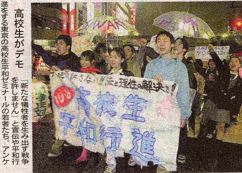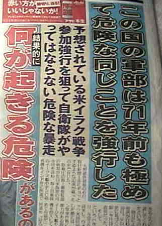 「北朝鮮は悪の枢軸のひとつ」と叫ぶアメリカ・ブッシュ政権が、「核疑惑」や「テロリスト擁護」などを理由に北朝鮮と軍事紛争を引き起こし、空爆を開始したら、周辺事態法によって自衛隊は「後方支援」のために出動することになるだろう。この出動は国際法上は戦争行為だから、北朝鮮側がアメリカと日本に反撃することは国際法上当然ということになる。その「危険」が迫ったら、防衛出動待機命令が発令され、「武力攻撃にいたらない段階から適切な措置をとる」必要があるから、国民が有事法制で駆り出される。