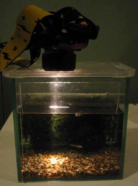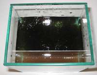 on tank walls and detritus on the tank's floor, reflections of scratchy plastic