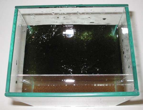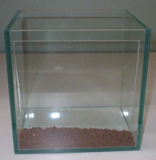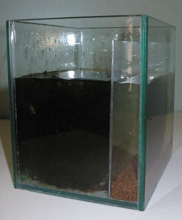 Java moss is placed in the rear portion of the tank to provide a background or backdrop, and water is slowly filled in.