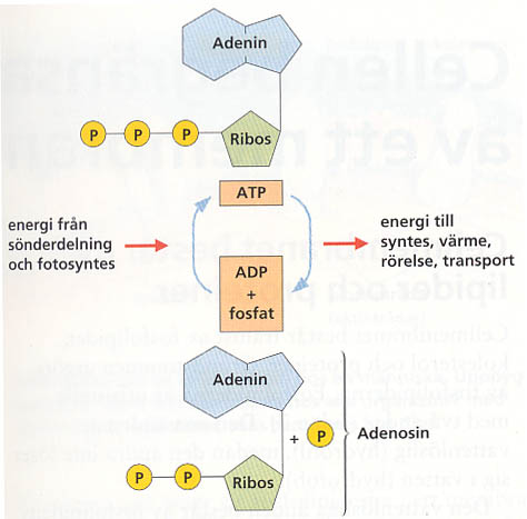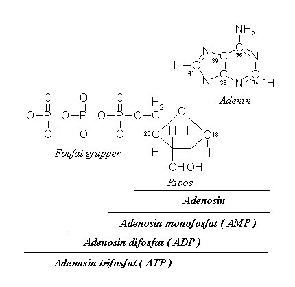 ATP : Adenosin Tri Phosphate. En energibärande molekyl, bestående av en adenin - ring, en ribos och tre fosfatgrupper. Bindningarna mellan adeninringen och posfatgrupperna är energirika, när de bryts, avges energi. ATP avger energi genom att enzymet ATP-as spjälker loss en fosfatgrupp och bildar en ADP (Adenosin di Phosphate; med två fosfatgrupper) och en fri fosfatgrupp.