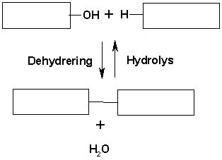 Dehydrering : Reaktion där en vätejon (H+) och en OH - grupp (OH-) bildar en vattenmolekyl. Sker oftast i kedjeförlängningsreaktioner, där em nonomer med en H+ - ända reagerar med en annan monomers OH- - ända. Resultatet blir att monomererna kopplas ihop till en dimer och vatten vildas ur H+ och OH-