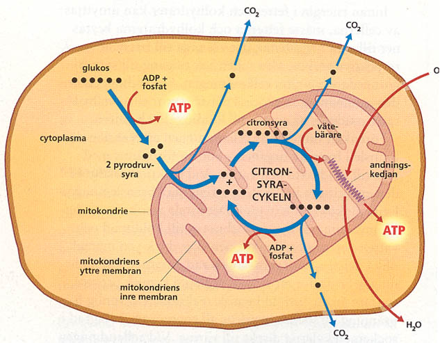 Kvar finns då fettsyror och aminosyror. Båda dessa och glukos bryts ner till acetyl – Coenzym – A i cellplasman. Vid reaktionen bildas koldioxid och ATP.