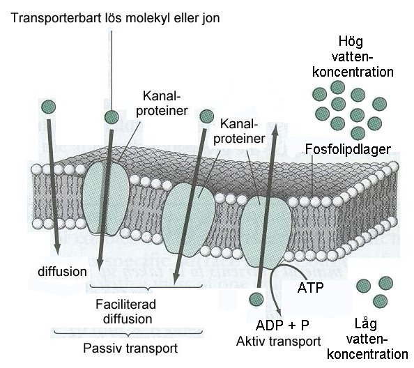 strävan efter utjämning av koncentrationer på membranets två sidor. Därför går vatten i diffusion från hög koncentrationer till låg. Molekyler större än vatten kan inte penetrera membranet måste de transporteras därigenom via kanalproteiner. Även här går transporten från hög koncentration till låg. Kanalproteinerna är formade som rör. De bildar ett hål som tränger rakt igenom cellmembranet. Kanalproteiner tillåter bara rörelse med koncentrationsgradienten genom diffusion. Vissa kanaler är alltid öppna, medan andra har portar som kan öppnas eller stängas. Om portarna är öppna eller inte beror av tillståndet inne i cellen eller av miljön utanför den. Cellen stänger portarna när salthalten utanför ökar och förhindrar på så sätt att jonkoncentrationen i cellen ökar.