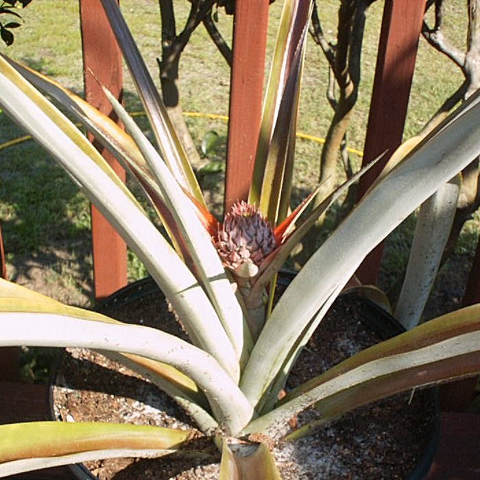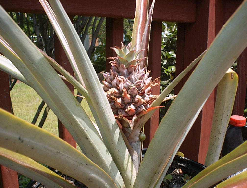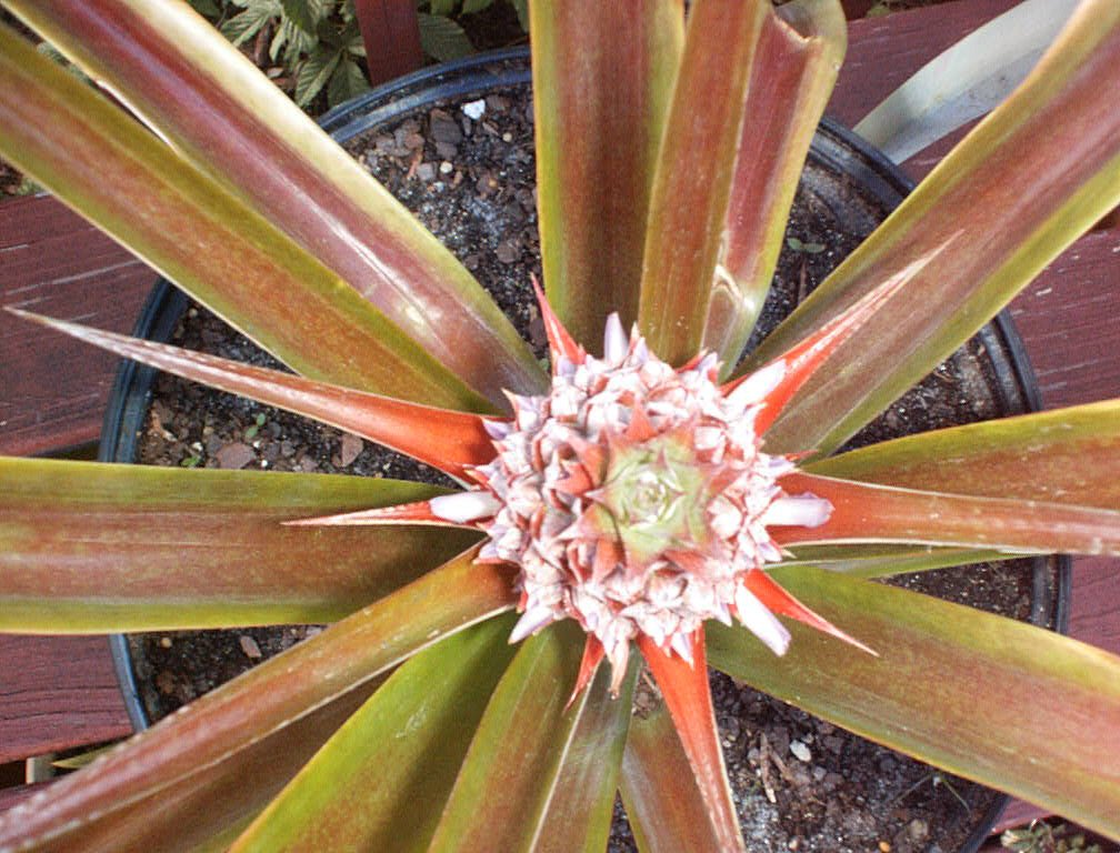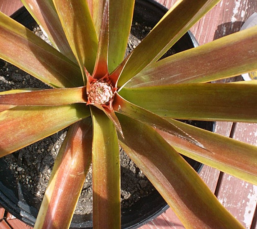 You can see the 'head' of the pineapple now, poking its way above the 'leaves' of the pineapple plant.