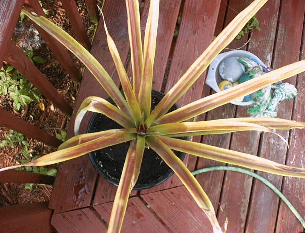 This is a view of a raggedy looking pineapple plant. The leaves have turned almost totally red! (Clue: Baby pineapple getting ready to emerge!!!)