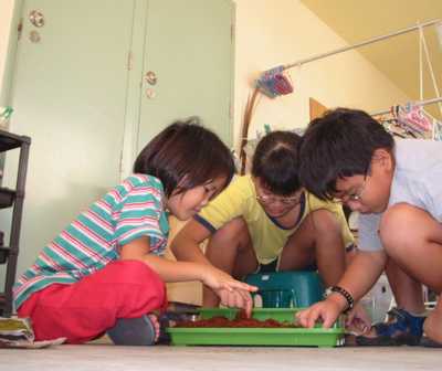 My youngest sister, Clara, is not helping. She just look at the worms wriggling around. |