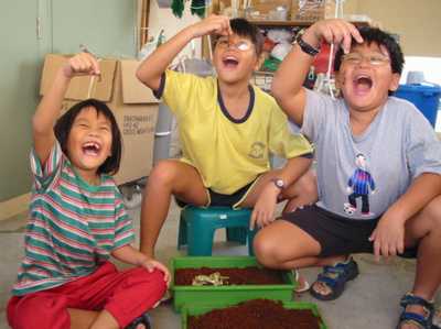 Daddy is teaching us about vermicomposting which means that worms are used to help turn the dead plants from compost into worm poo poo. (Daddy's note: the proper word for the 'poo-poo' is vermicast)