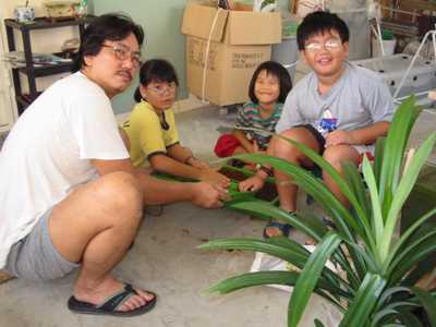 | Daddy is preparing a piece of vegetable for us to feed the worm. |