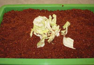There is a box with holes on the bottom, a tray and a cover. The brown soil above the box is coir. Coir is actually coconut husk that is broken up into many fine pieces. The worm will live and multiply in the coir. |