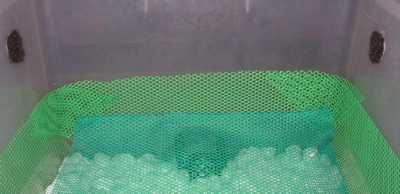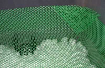 The bottom is laid with packing chips so that the worms won't drown in their own pee ;o) It'll also allow the worms to climb up onto the chips, through the nets and back into their bed. A plastic grid is added to avoid the pvc drainage getting clogged by the chips. |