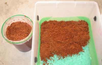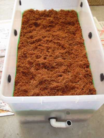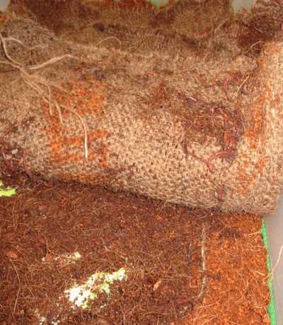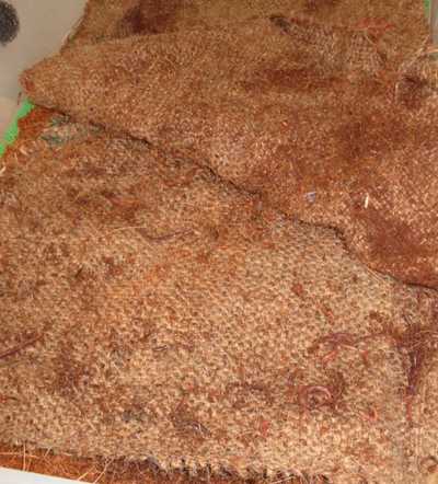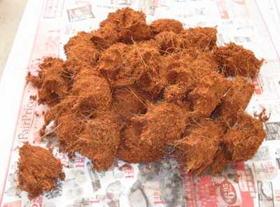 | The coir is soaked in water, hand squeezed until damp and then fluffed up again before laying it onto the nets. |