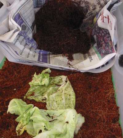 | A crushed cabbage leaf is placed on their bed and I'm ready to dump the worms over it. |