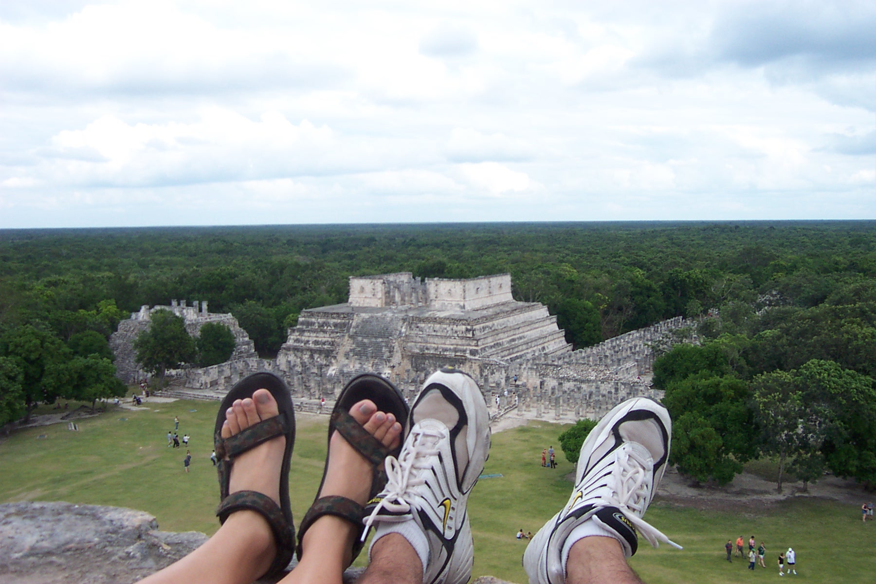 This is a picture of the feet that climbed the pyramid at Chicen Itzá. The pillars that you can see below were part of a marketplace.