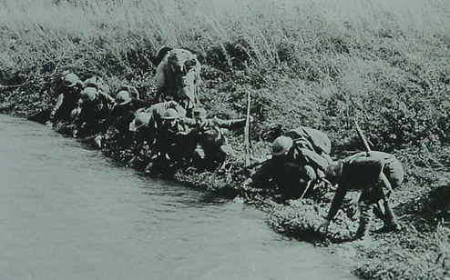 Being weak from loss of blood, I crawled about half the way and stopped to get my breath. I looked back and saw that I had left a bloody trail behind me from dragging the wounded leg. The feeling of fright passed but I nevertheless crawled to the railroad embankment, up it's side and over the rails, tumbling into a little pocket which had been dug by the previous troops on the other side.