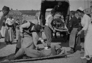 When the ambulances were ready we were put on them again to be carried to the next base hospital. This place was a very large barn, or something of the kind. It was full of stretchers and cots with doctors and nurses about.