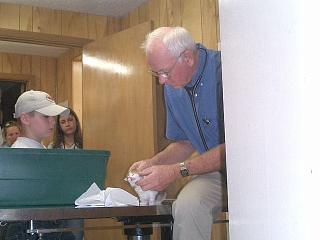 The doctor examines a kitten that was brought in. Erika is by the