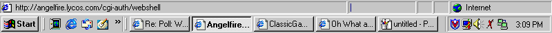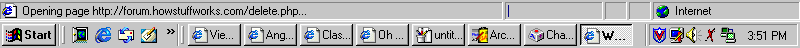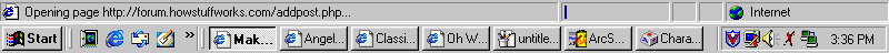If you go to the bottom right of the picture and to the left of the clock, you see two monitors. When these two monitors are both light-colored like this, [yours may look a little different, however] that means that there is communication and that your page is downloading constantly. Ever notice that when you click on a link, such as those at the bottom, the two monitors will light up? That's how you tell when there's activity. However, while reading this, you may notice that they are darkened: