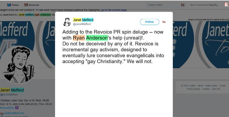 After Ryan Anderson’s duplicity was exposed, Janet Mefferd had no choice but to distance herself from her esteemed guest. Her short-lived and hardly adequate protest was tweeted in June of 2018, but then mysteriously vanished. Here is a screenshot of the cached tweet: