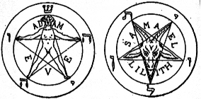 "The star of the microcosm, or the MAGIC PENTAGRAM, that star wherein the human figure was represented by Agrippa, with the head in the ascenidng point and the four members in the four other points--the Burning STAR, WHICH, WHEN INVERTED, IS THE HIEROGLYPHIC SIGN OF THE GOAT OF BLACK MAGIC, whose head can then be sketched in the star with the two horns above, the ears on the right and left, and the beard below, sign of antagonism and blind fatality, the goat of lewdness assaulting heaven with its horns, a sign execrated even in the Sabbath by initiates of a superior order. . .