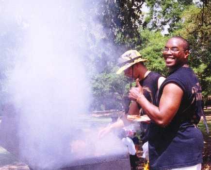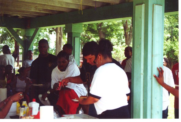Brother Brandon DeCuir serves food at the Probate picnic later that afternoon