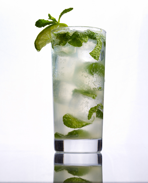In a tall thin glass, crush part of the mint with a fork to coat the inside. Add the sugar and lemon juice and stir thoroughly. Top with ice. Add rum and mix. Top off with the club soda (or seltzer). Add a lemon slice and the remaining mint. Serves one.