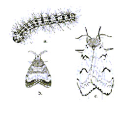 Şekil 1. Lymantria dispar L. (a-Larva, b- Erkek, c-Dişi Kelebek)