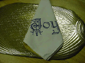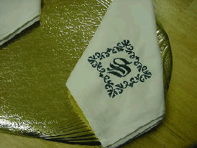 AS YOU CAN SEE THESE ARE LARGE NAPKINS....FIT VERY NICELY IN YOUR LAP OR EVEN AS A BIB NAPKIN....THE ALPHABET DESIGN IS BY SWEET SENSATIONS....LOTS OF FUN...HER NEWEST ALPHABET...BE SURE AND VISIT HER SITE FOR SOME FUN DESIGNS....I AM USING THESE NAPKINS AS CENTER CLOTHS FOR A SMALL KITCHEN TABLE AS WELL AS PUTTING THEM OVER A TABLE RUNNER ON MY LARGE DINING ROOM TABLE....ALSO GREAT FOR BREAD CLOTHES....AND OF COURSE NAPKINS