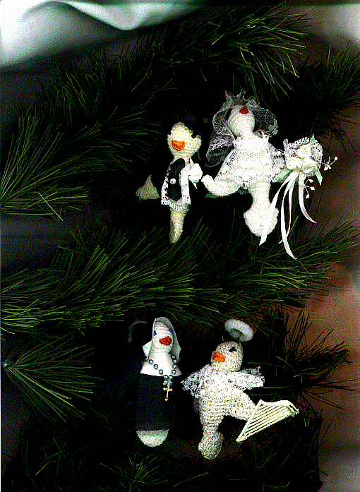 These little 'Bird' Christmas Tree ornaments are about two and a half inches tall... I have made and given away many of them, each dressed differently so that no two were the same.One Christmas I gave one to each of my family members, including nieces, nephews, grandsons, sisters, kids, and anyone else who wanted one... I still have many of them... Here are but a few, to give you an idea of what they look like...
