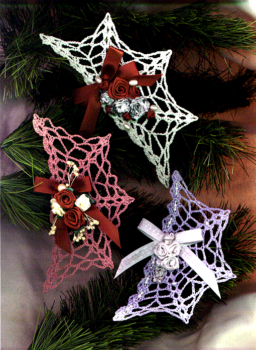 Here's some other Christmas Tree ornaments that I've made... There's a sample of the "Christmas Bells", "Fans", and a few "Hats"...The Bells are about three inches tall, the Fans, the same and the Hats are about two and a half inches in diameter...