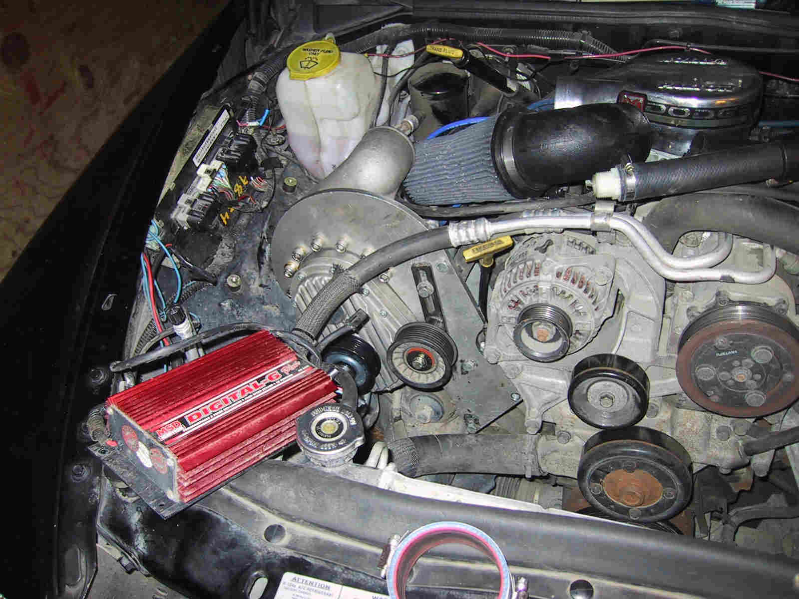 This image is where the whole install is complete and I went to autozone to pick up another idler pully on the S/C because the one that came during shipping was damaged. Anyways. The MSD is out of it for the time being. Bypass valve is bypassed, currently running a 10:1 FMU plate (changing to 12:1 in a bit) The truck pulls a lot harder, I can actually side around corners if I dont' watch my gas pedal, and I did a hell of a 2nd gear scratch on an automatic-running 275/35/18s in the back with a limited slip differential!