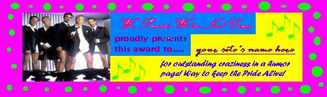 Wow! Wouldn't you feel special if you won our award? I'd feel special if we weren't us and not allowed to win it. I mean, just look at it! Splendificent! And if you submit to us in an e-mail, your site URL, site name, and your name(s) you too, could win! If you'd like to enter your site to win our award send the vitals to this address: hsjuliet@usa.net Re: Splendificent Award **And if you would be ever so kind to keep on clicking on the random background button... you'll really get the feeling of Las Vegas awards...maybe..look at all thpse pretty colours...sigh...**