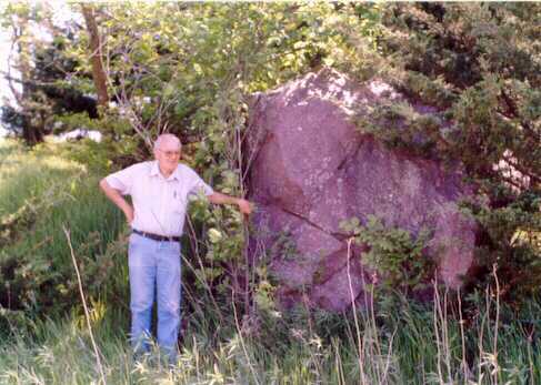 Pictured with the rock is Jim McDowell of Red Cloud, Nebraska. Jim is over 6 feet tall, so you can see the rock is nearly 10 feet high. The edge of the roadbed is nearly at Jim's feet, so the road almost had to detour around the rock. The movement of this boulder demonstrates the uncanny power of the encroaching ice.