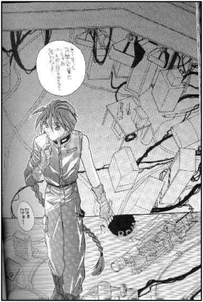 This appears to be the work of 2 artists, one drawing Duo, and the other Heero. I really don't like this Heero--he looks like somebody snatched him from daycare O_O Still, you get a nice variety of styles and fashions on Duo, which is always fun ^_^ I believe the innocent looking Heero in the tank top is some sort of computer projection, while the real Heero is the one in uniform who glowers all the time.