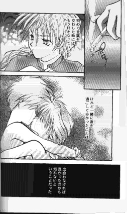 There are two stories. The first is just a spoof in which Heero has nothing to wear except an apron, thanks to Duo's machinations *sweatdrops* The funny bit comes in where Duo is then forced by Heero to wear a huge animal costume *snicker* The second story is more serious. It takes place when Duo was captured and Heero rescues him. Heero sits worried by Duo's bed, then Duo wakes up and... it's 'x' for a reason folks ^^