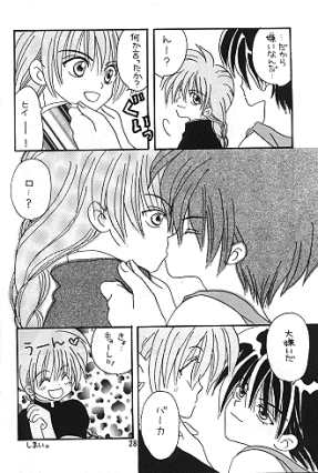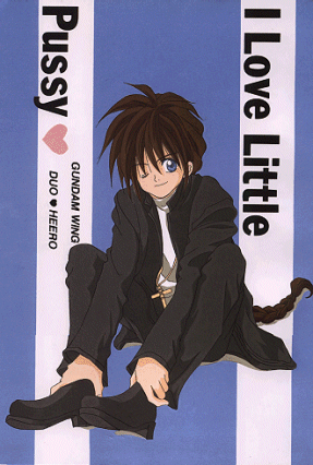 At first, I was disappointed. A yaoi dj with a name like "I Love Little Pussy", I wasn't quite sure what to expect. I was hoping for either a neko story, or else something perversly (if mis-named) hentai. This was neither. Its just a very cute, very sweet light romance. Duo is pining over Hiiro (who is being aloof as usual). Overcome with emotion, he hugs Quatre. And of course, it is at this moment that Hiiro happens by. Misunderstanding abounds, and Duo tries to make things right, and then he tries to steal a kiss ::doki doki:: which Hiiro deftly escapes. But just as Duo is about to walk away, Hiiro changes his mind, grabs our boy and proceeds to smash their mouths together. And looks oh-so-coy afterwords ::happy sigh::
